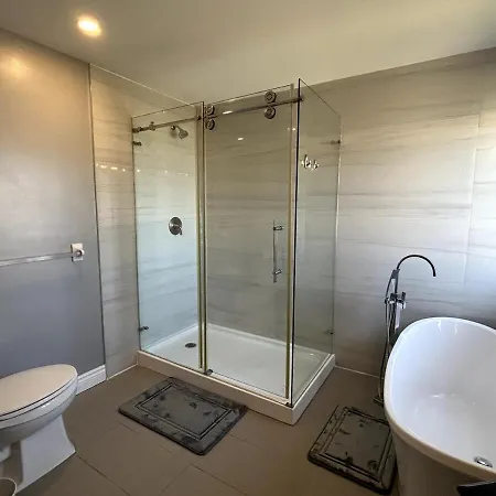 Bathroom facilities also include a tub, a separate toilet, and a shower. A hair dryer, a shower cap, and bath sheets are included for added comfort.
